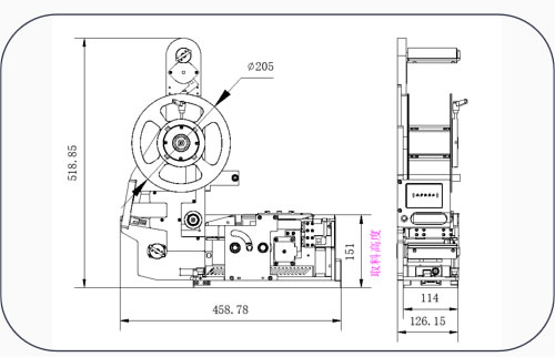Application: The front-push roll feeder is suitable for automatically peeling and feeding roll materials such as paper labels, protective films, foams, double-sided tapes, conductive tapes, copper foils, steel sheets, and reinforcement plates.